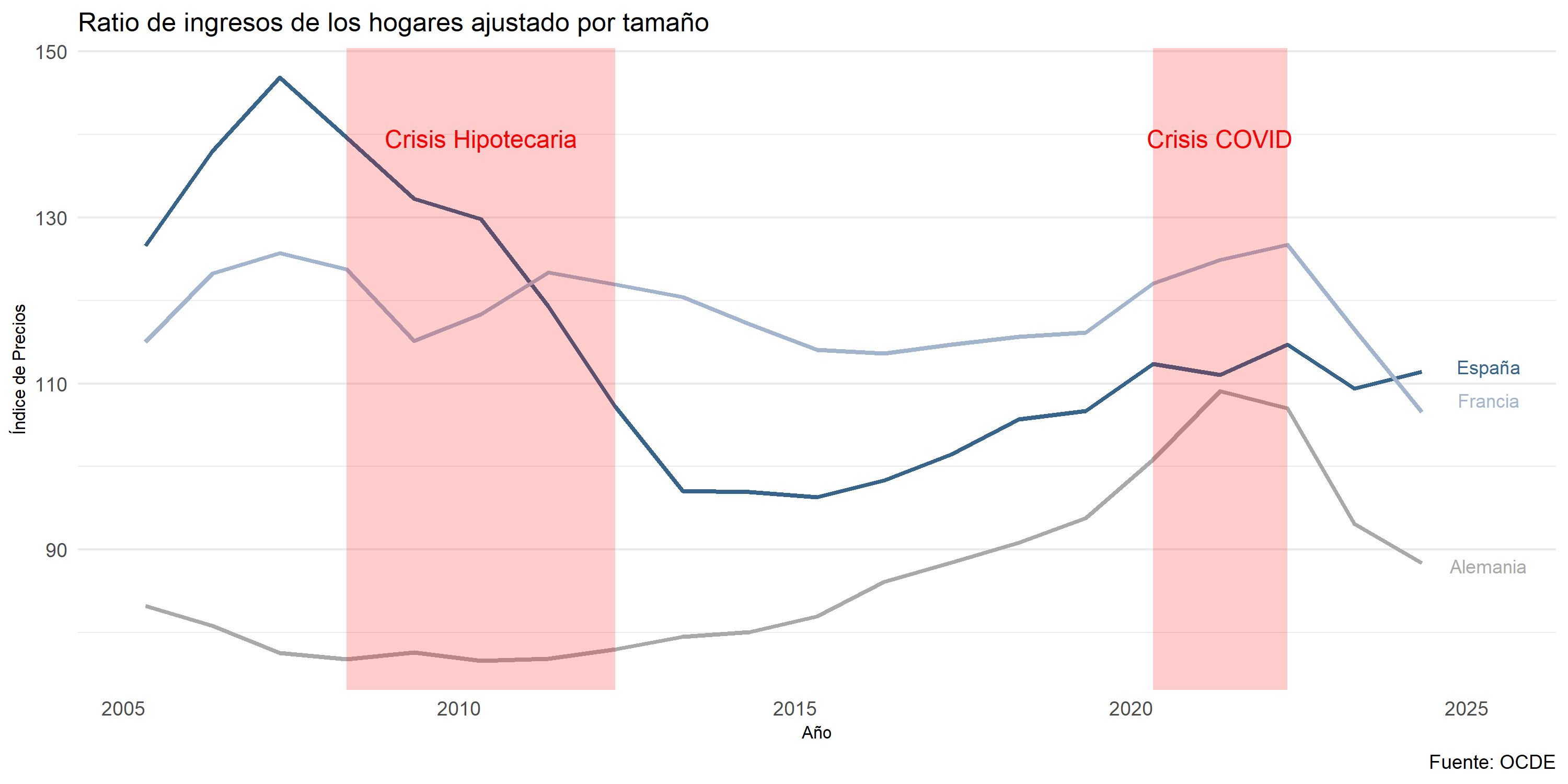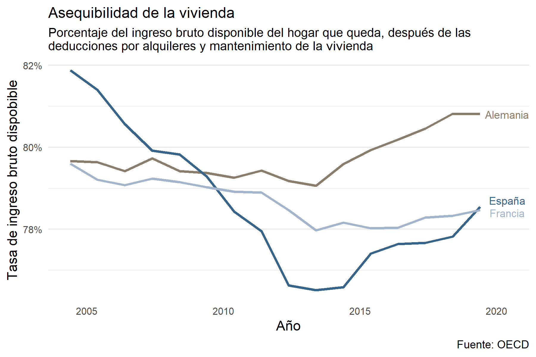 #Asequibilidad de la viviendadf_05 <- rio::import("./datos/Housing_affordability.csv")codigos_paises_03 <-c("ESP", # España"FRA", # Francia"DEU"#Alemania )df_06 <- df_05 %>%select("REF_AREA", "OBS_VALUE", "TIME_PERIOD") %>%filter(REF_AREA %in% codigos_paises_03)ggplot(data = df_06, aes(x = TIME_PERIOD, y = OBS_VALUE)) +geom_line(data= df_06 %>%filter(REF_AREA =="DEU"), aes(color = REF_AREA, group = REF_AREA), color ="#8B7D6B", linewidth =1)+geom_line(data= df_06 %>%filter(REF_AREA =="ESP"), aes(color = REF_AREA, group = REF_AREA), color ="#36648B", linewidth =1) +geom_line(data= df_06 %>%filter(REF_AREA =="FRA"), aes(color = REF_AREA, group = REF_AREA), color ="#A2B5CD", linewidth =1) +scale_y_continuous(labels =function(x) paste0(x, "%")) +labs(title ="Asequibilidad de la vivienda",subtitle ="Porcentaje del ingreso bruto disponible del hogar que queda, después de las \ndeducciones por alquileres y mantenimiento de la vivienda",x ="Año",y ="Tasa de ingreso bruto dispobible",caption ="Fuente: OECD") +annotate("text", x =2020, y =78.4, label ="Francia", color ="#A2B5CD", size =3) +annotate("text", x =2020, y =78.7, label ="España", color ="#36648B", size =3) +annotate("text", x =2020, y =80.8, label ="Alemania", color ="#8B7D6B", size =3) +theme_minimal() +theme(panel.grid.major.x =element_blank(), panel.grid.minor.x =element_blank(), axis.text.x =element_text(angle =0, hjust =1, size =8),axis.text.y =element_text(size =8), plot.title =element_text(family ="sans",size =12,face ="plain"), plot.subtitle =element_text(family ="sans",size =10,face ="plain"))