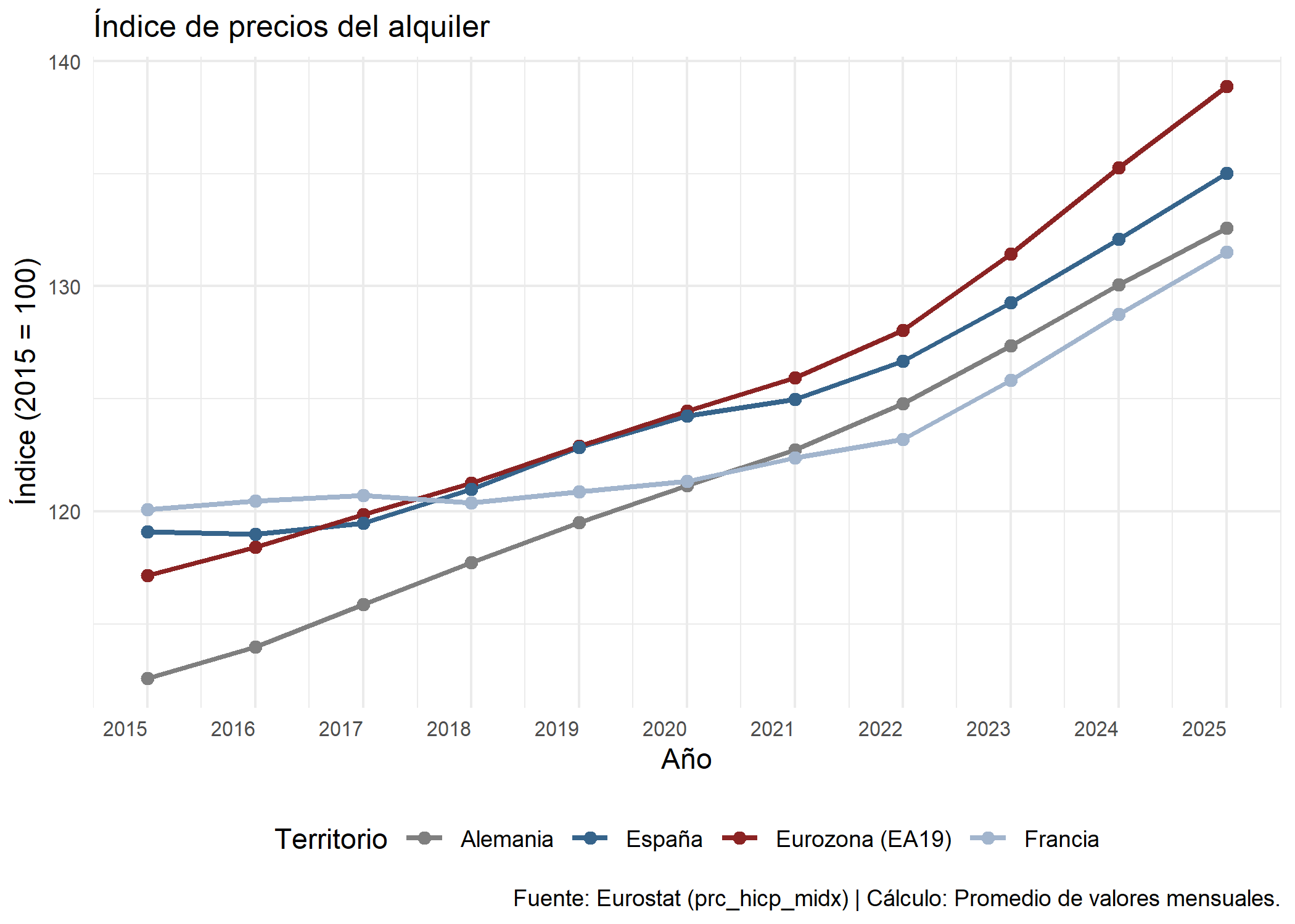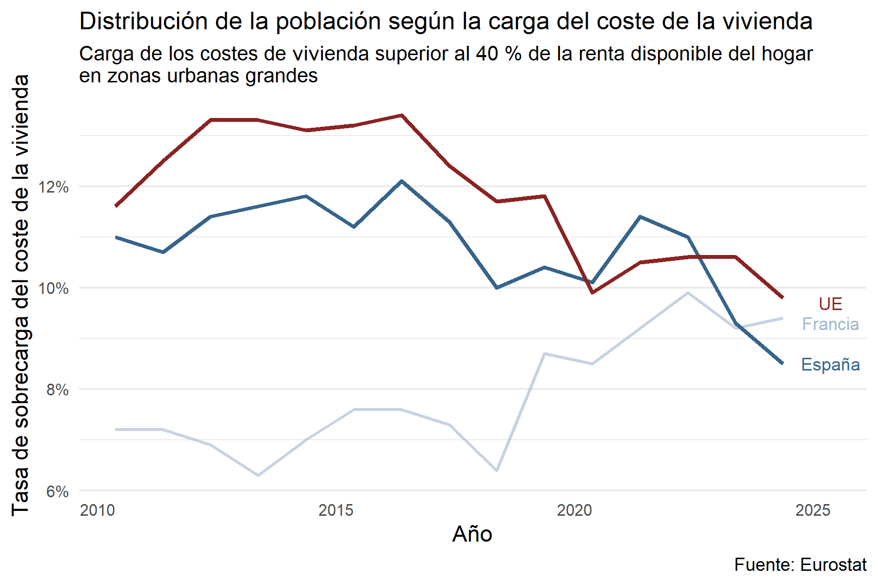 my_table <-"ilc_lvho29"label_eurostat_tables(my_table) #> [1] "Distribution of population by housing cost burden and degree of urbanisation"df <-get_eurostat(my_table, time_format ='raw', keepFlags =TRUE)#> indexed 0B in0s, 0B/sindexed 2.15GB in0s, 2.15GB/sdf %>%distinct(unit)#> # A tibble: 1 × 1#> unit #> <chr>#> 1 PCdf %>%distinct(freq) #> # A tibble: 1 × 1#> freq #> <chr>#> 1 Acodigos_paises <-c("EU27_2020","ES", # España"FR", # Francia"DE", # Alemania"IT", # Italia"BE", #Belgica"PT", #Portugal"IE"# Irlanda)codigos_paises_00 <-c("EU27_2020","ES", # España"FR"# Francia)df_0 <- df %>%filter (TIME_PERIOD >=2010) %>%filter(freq =="A") %>%filter(deg_urb =="DEG1") %>%filter(indic_il =="A40DI") %>%filter(geo %in% codigos_paises_00) %>%filter( unit =="PC", !is.na(values) ) %>%mutate(TIME_PERIOD =as.integer(TIME_PERIOD))ggplot(data = df_0, aes(x = TIME_PERIOD, y = values)) +geom_line(aes(group = geo), color ="#A2B5CD", linewidth =0.7, alpha =0.6) +geom_line(data = df_0 %>%filter(geo =="ES"), aes(group = geo), color ="#36648B", linewidth =1) +geom_line(data = df_0 %>%filter(geo =="EU27_2020"), aes(group = geo), color ="#8B2323", linewidth =1) +scale_y_continuous(labels =function(x) paste0(x, "%")) +labs(title ="Distribución de la población según la carga del coste de la vivienda",subtitle ="Carga de los costes de vivienda superior al 40 % de la renta disponible del hogar \nen zonas urbanas grandes ",x ="Año",y ="Tasa de sobrecarga del coste de la vivienda",caption ="Fuente: Eurostat" ) +annotate("text", x =2025, y =8.5, label ="España", color ="#36648B", size =3) +annotate("text", x =2025, y =9.3, label ="Francia", color ="#A2B5CD", size =3) +annotate("text", x =2025, y =9.7, label ="UE", color ="#8B2323", size =3) +scale_y_continuous(labels =function(x) paste0(x, "%")) +theme_minimal() +theme(legend.position ="right", panel.grid.major.x =element_blank(), panel.grid.minor.x =element_blank(), axis.text.x =element_text(angle =0, hjust =1, size =8),axis.text.y =element_text(size =8), plot.title =element_text(family ="sans", size =12, face ="plain"), plot.subtitle =element_text(family ="sans", size =10, face ="plain") )