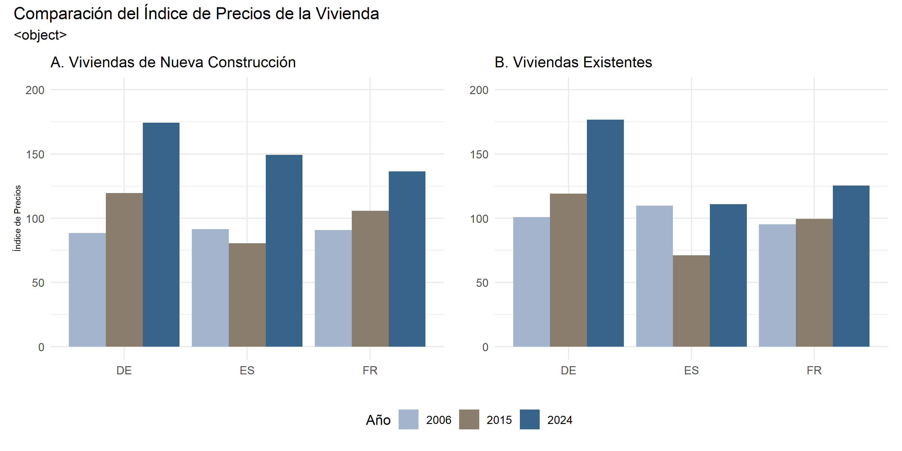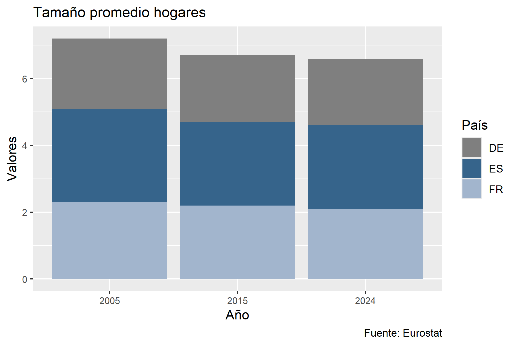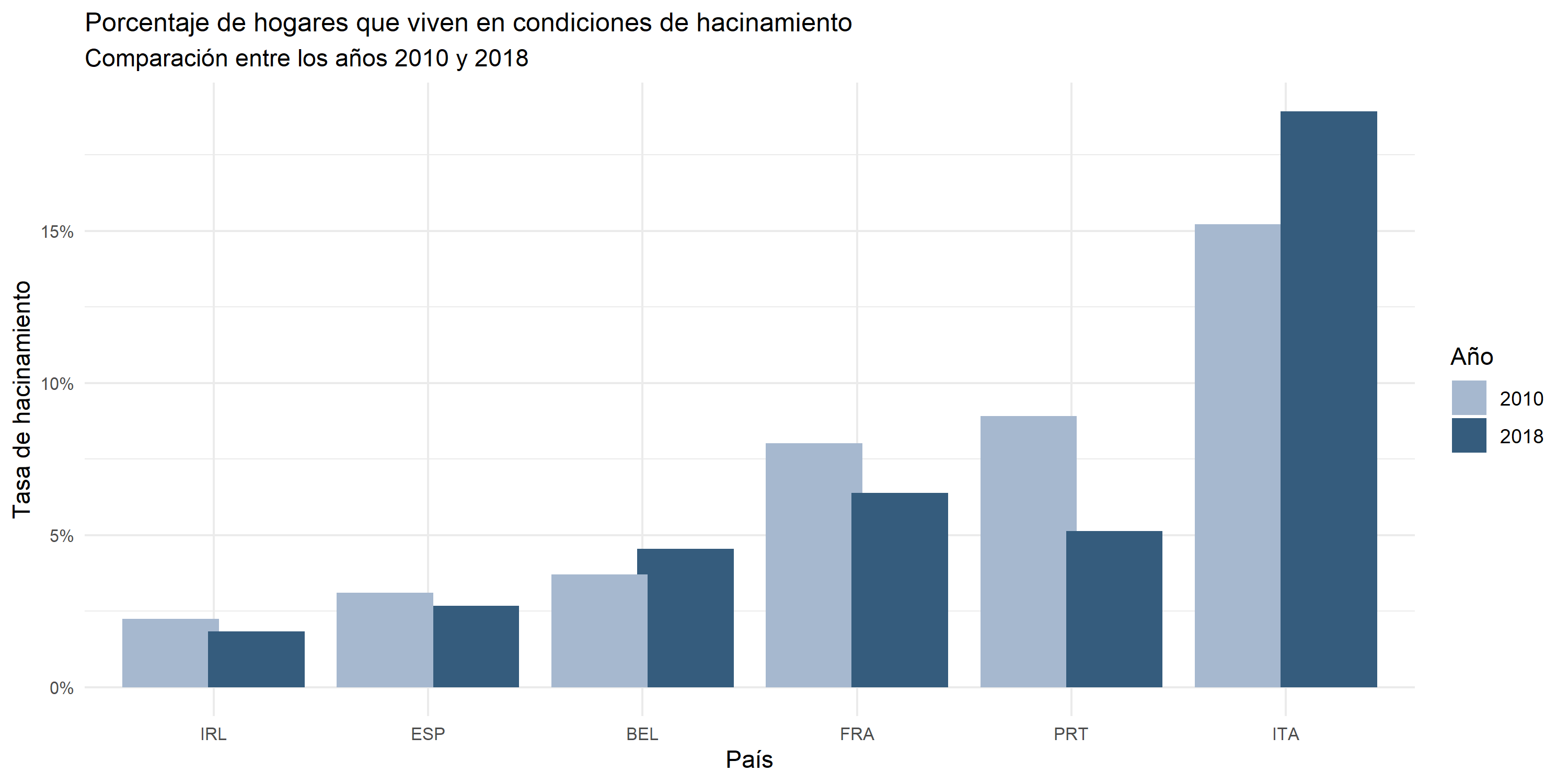 #Hogares que viven en condiciones de hacinamientodf_03 <- rio::import("./datos/Households_living_in_overcrowded_conditions.csv")codigos_paises_02 <-c("ESP", # España"FRA", # Francia"ITA", # Italia"BEL", #Belgica"PRT", #Portugal"IRL"# Irlanda)df_04 <- df_03 %>%select(REF_AREA, OBS_VALUE, TIME_PERIOD) %>%filter(REF_AREA %in% codigos_paises_02) %>%filter(TIME_PERIOD %in%c(2010,2018))df_04 %>%mutate(REF_AREA =fct_reorder(REF_AREA, OBS_VALUE, .fun = max)) %>%ggplot(aes(REF_AREA, OBS_VALUE, fill =factor(TIME_PERIOD))) +geom_col(position =position_dodge(0.8)) +scale_fill_manual(values =c("2010"="#A6B8CF","2018"="#355C7D" )) +scale_y_continuous(labels =function(x) paste0(x, "%")) +labs(title ="Porcentaje de hogares que viven en condiciones de hacinamiento",subtitle ="Comparación entre los años 2010 y 2018",x ="País",y ="Tasa de hacinamiento",fill ="Año" ) +theme_minimal() +theme(plot.title =element_text(family ="sans",size =12,face ="plain"), axis.text.x =element_text(size =8),axis.text.y =element_text(size =8))