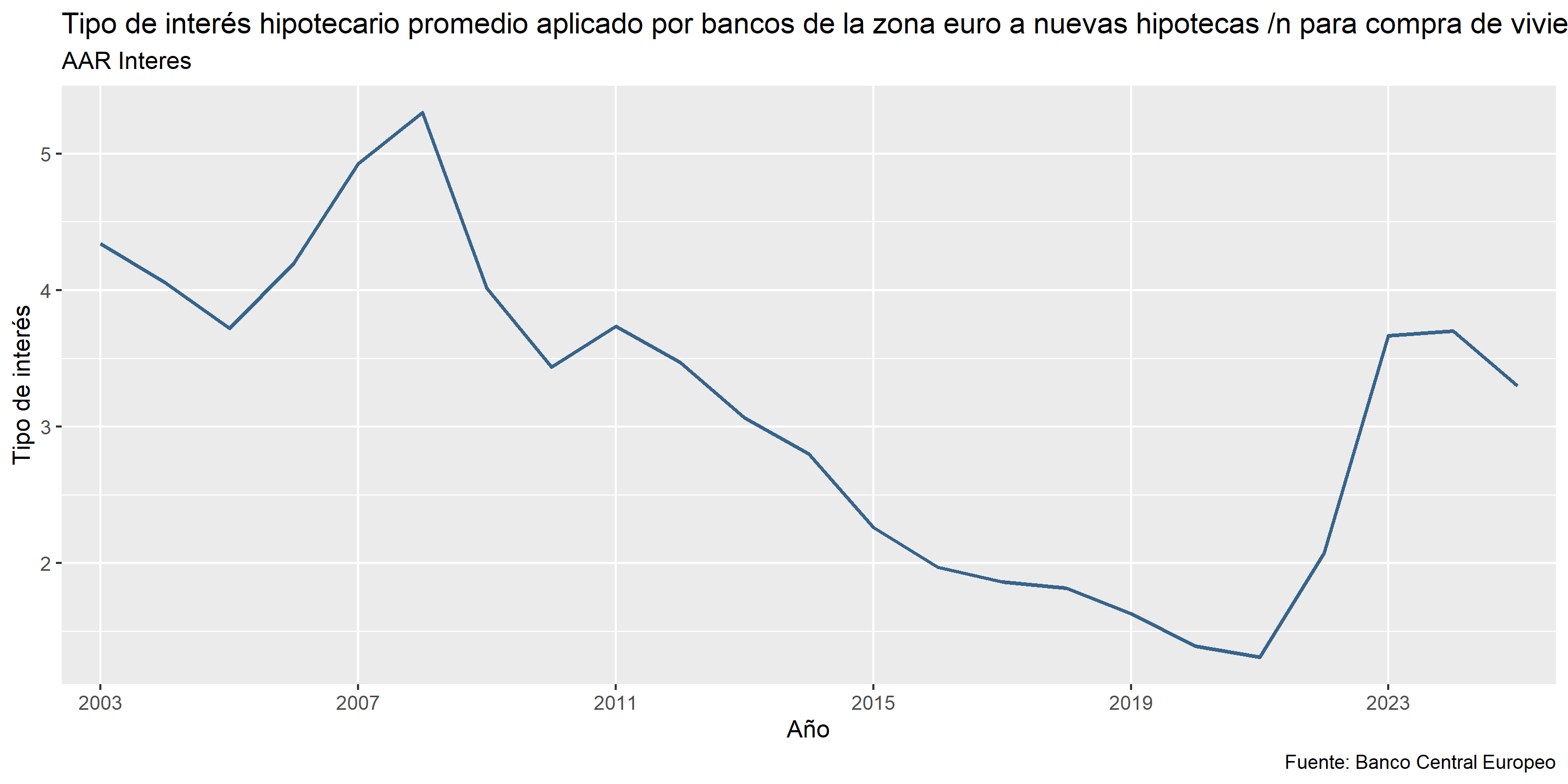 tabla_tipo_interes <- rio::import("./datos/datos_ECB_tipo_interes.csv")tabla_tipo_interes_2 <- tabla_tipo_interes |>separate(`TIME PERIOD`, into =c("Year", "Month"), sep =4) |>group_by(Year) |>summarise(media_anual_interes =mean(`Cost of borrowing for households for house purchase (MIR.M.U2.B.A2C.AM.R.A.2250.EUR.N)`))ggplot(tabla_tipo_interes_2, aes(x = Year, y = media_anual_interes)) +geom_line(aes(group =1), color ="#36648B", linewidth =0.8) +labs(title ="Tipo de interés hipotecario promedio aplicado por bancos de la zona euro a nuevas hipotecas /n para compra de vivienda", subtitle ="AAR Interes", x ="Año", y ="Tipo de interés", caption ="Fuente: Banco Central Europeo") +scale_x_discrete(breaks =seq(2003, 2025, by =4))