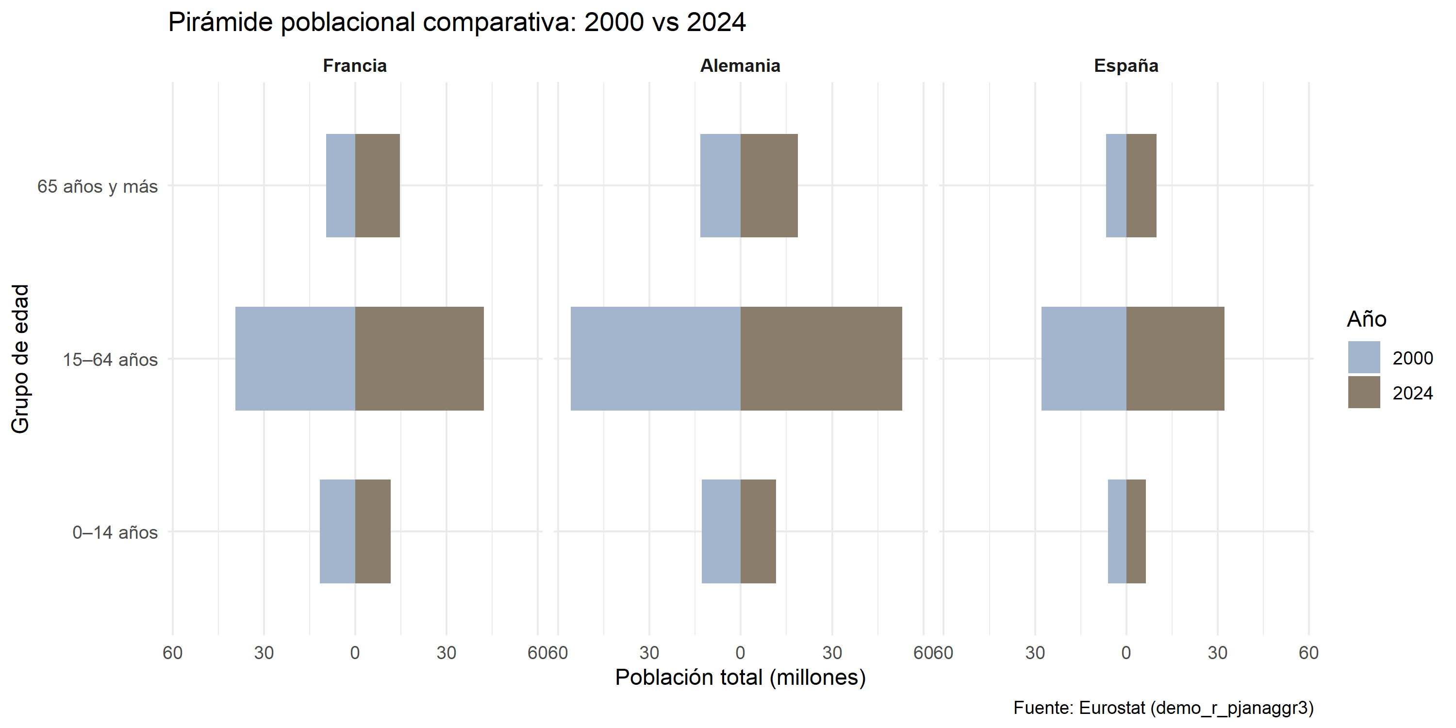 Se compara la estructura por edades en 2000 y 2024.